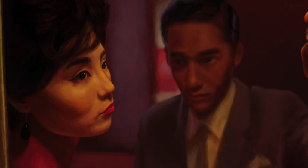 La relación entre Su Li-zhen y Chow Mo-wan es el arquetipo de la imposibilidad. De miradas que quieren cruzarse pero pasan de largo. Del contacto físico interpuesto a través de objetos, que deviene casi en caricias. Sólo consuman por vía interpuesta, a través de sus parejas.