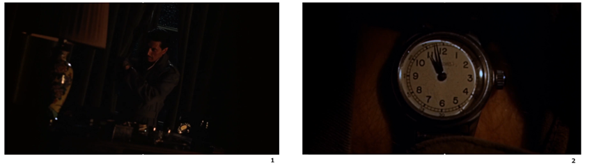 A punto de esconderse, el asesino consulta el reloj, y es gracias al plano detalle (y, por tanto, al montaje) que sabemos que está a punto de llegar la hora.