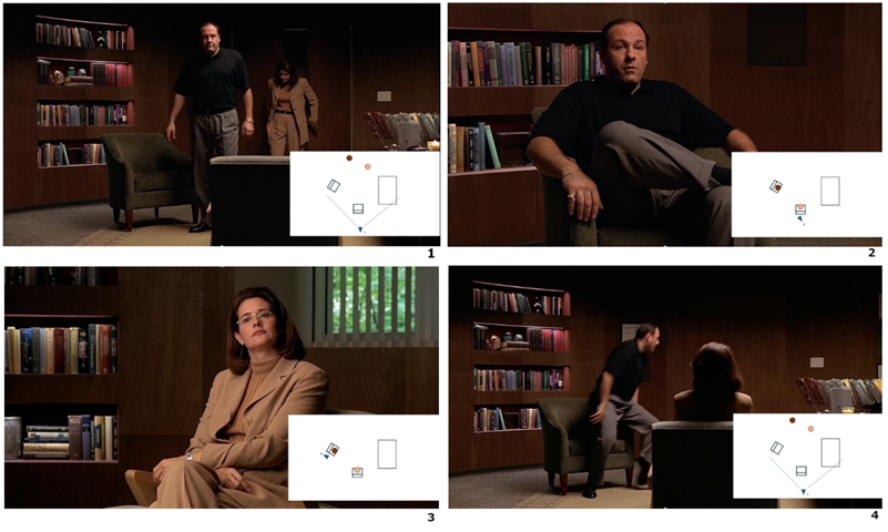 Podemos verlo en una de las primeras secuencias de Los Soprano, cuando Tony visita a la psicóloga. La entrada a su despacho es en plano general (1), seguida de un campo/contracampo (2, 3) y, finalmente, cuando el mafioso se marcha enfadado, regresamos al plano general (4).